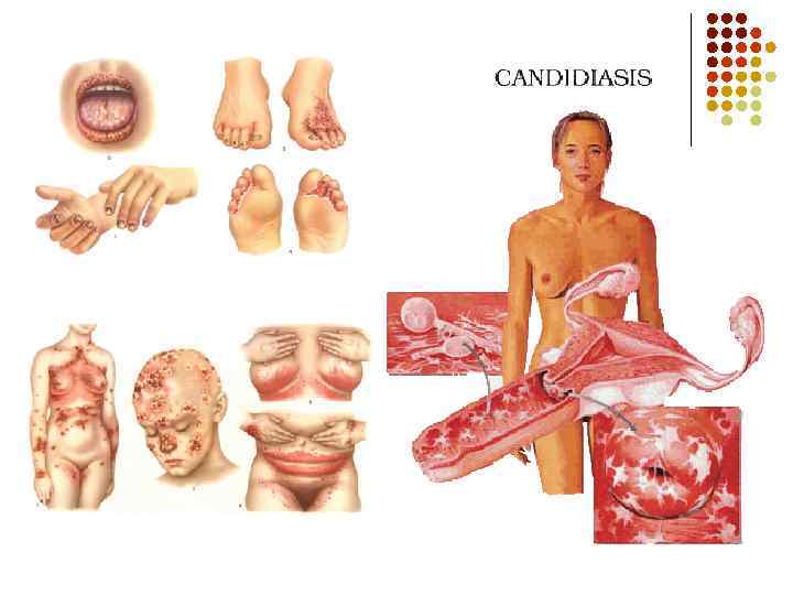 Кандидоз l Инфекционное заболевание, вызываемое различными штаммами гриба кандида (Candida) Инфекции слизистых оболочек, кожи, полости рта или влагалища. l Эти инфекции чаще встречаются у больных сахарным диабетом, СПИДом и у беременных женщин.