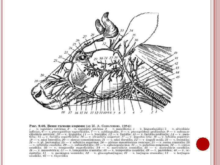 ВЕНИ ГОЛОВИ Зовнішня яремна вена (1): проходить по шиї поверхнево, під шкірою, в яремному жолобі між плечоголовним і груднино-головним м'язами починається каудально від привушної слинної залози двома венами – язиково-лицевою і щелепною