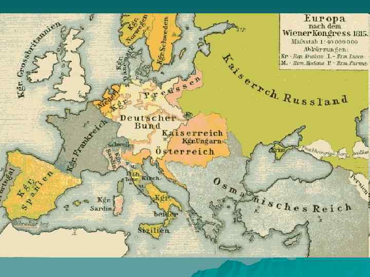 Итоги: Пруссии досталась часть Саксонии, значительная территория Вестфалии и Рейнской области. u Был образован Германский союз (30 княжеств). u Дания, бывшая союзница Франции, лишилась Норвегии, переданной Швеции. u В Италии была восстановлена власть папы римского над Ватиканом и Папской областью, а Бурбонам вернули Королевство Обеих Сицилий. u