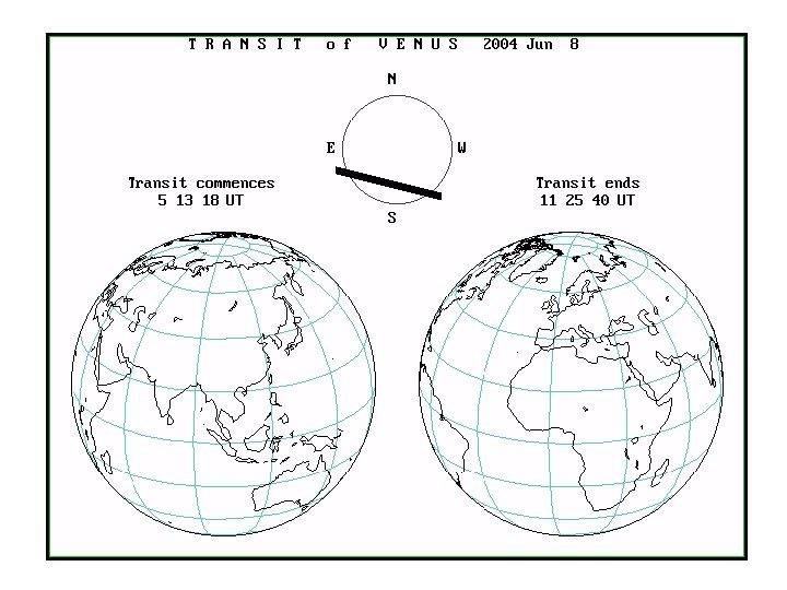 Details of 2004 Visibility External Ingress: 05: 13: 25 UT Internal Ingress: 05: 32: 52 UT Maximum: 08: 19: 40 UT Internal Egress: 11: 06: 30 UT External Egress: 11: 25: 56 UT Angular speed across disk of sun about 0. 4 degrees in 6 hours = 0. 07 degrees/hour. Diameter of Venus disk = 58. 6 arc seconds.