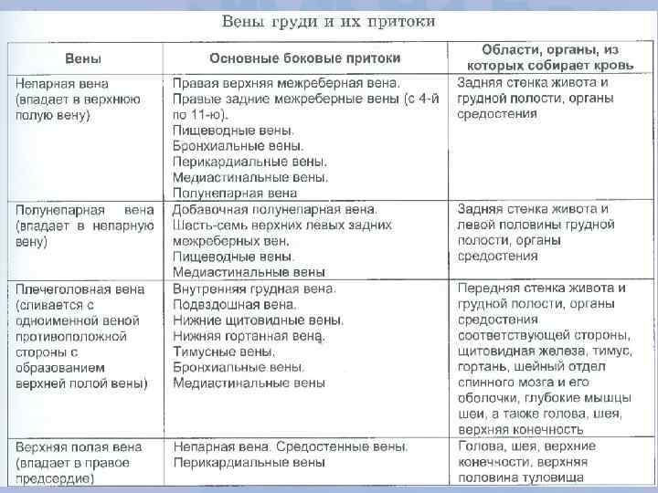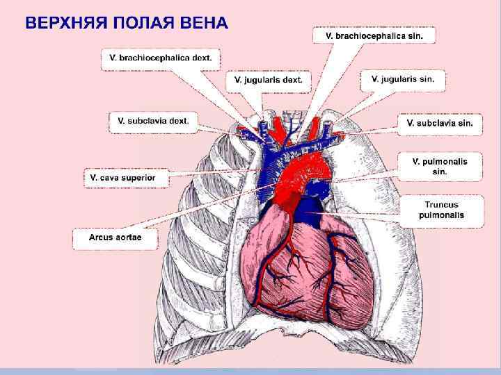 ВЕРХНЯЯ ПОЛАЯ ВЕНА , V. cava superior Корни: vv. brachiocephalicae dextra et sinistra (плечеголовные правая и левая вв. ) Приток: v. azygos (непарная вена) Собирает кровь: • от головы и шеи, верхних конечностей, • стенок и органов грудной полости, частично • от стенок брюшной полости.