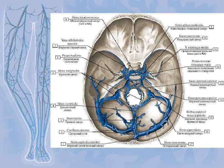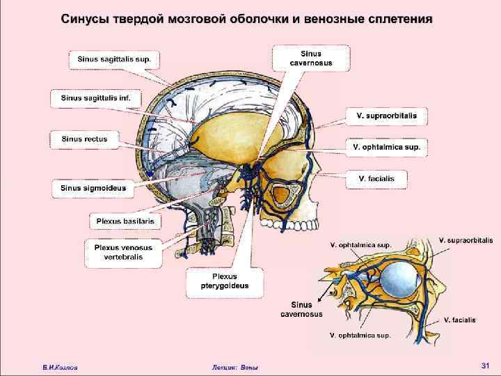 Опасная зона лица (треугольник) • Здесь вены лица анастомозируют с венозными синусами твердой оболочки головного мозга. Эти вены лишены клапанов => высокий риск распространения бактериальной инфекции в полость черепа => менингит