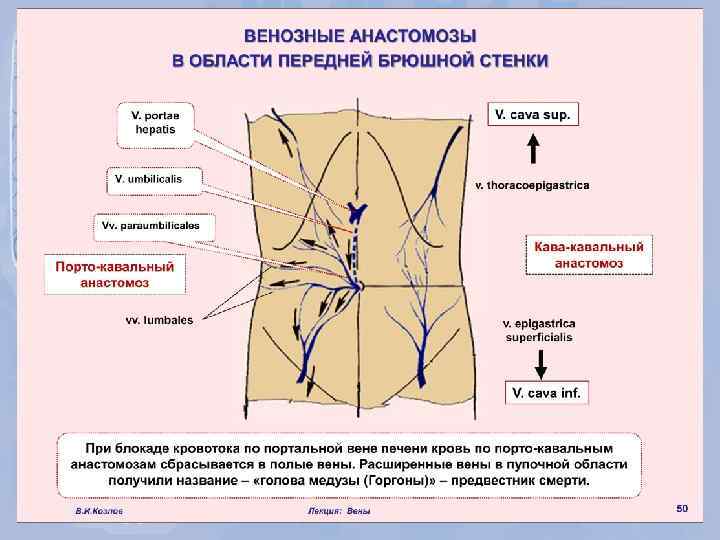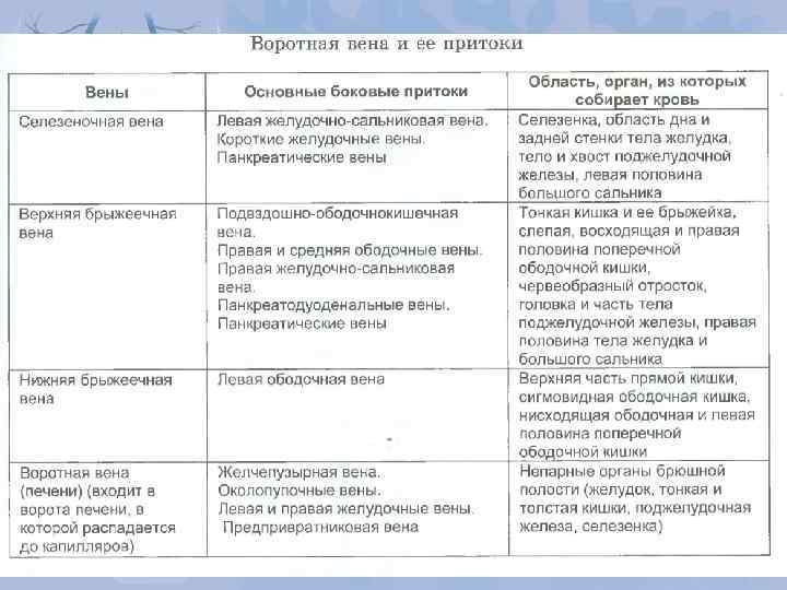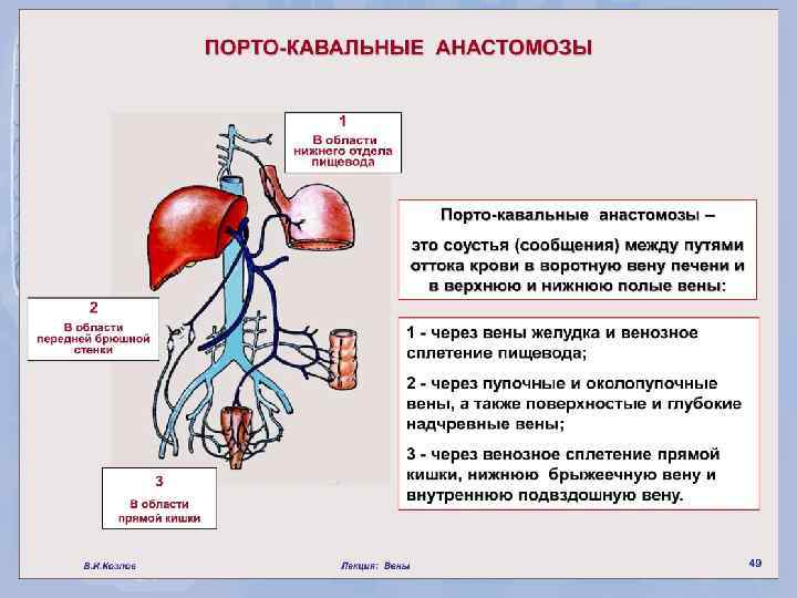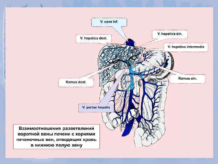 ВОРОТНАЯ ВЕНА ПЕЧЕНИ, v. portae hepatis Корни: v. lienalis (селезеночная), v. mesenterica superior (верхняя брыжеечная) Притоки: • v. cystica (пузырная), • vv. paraumbilicales (околопупочные), • v. pancreaticoduodenalis superior posterior (задняя верхняя поджелудочно -двенадцатиперстная), • vv. gastricae dext. et sin. (желудочные правая и левая), • v. prepylorica (предпривратниковая) Ветви: r. dexter, r. sinister Собирает кровь: от селезенки, органов пищеварительной системы (желудка, поджелудочной железы, тонкой кишки, толстой кишки, кроме нижних 2/3 прямой кишки и печени)