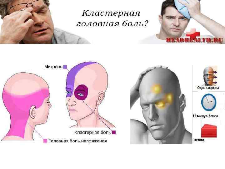 Диагностические критерии пучковой (кластерной) головной боли Пучковая (кластерная) головная боль характеризуется наличием так называемых «пучков» (кластеров) – периодов обострения, во время которых приступы головной боли возникают ежедневно. Критерии диагноза пучковой (кластерной) головной боли: приступообразная головная боль; сверлящий, жгучий, пульсирующий характер боли; головная боль значительной интенсивности; односторонняя головная боль; частая локализация боли: височная область, орбитальная, пара- и ретроорбитальная область; часто приступы головной боли возникают ночью или утром; ГБ сопровождается вегетативными нарушениями: слезотечение, гиперемия конъюнктивы, отек век, миоз, птоз, заложенность носа или ринорея, гипергидроз в области лица, бледность, иногда брадикардия. В большинстве случаев отмечается односторонняя головная боль без смены сторон, продолжительностью от 15 минут до нескольких часов, возникающая несколько раз в сутки, чаще в ночное время. Большинство пациентов, страдающих пучковой головной болью, – мужчины. Вариантом пучковой головной боли, которая преимущественно встречается у женщин, является хроническая пароксизмальная гемикрания – частая головная боль продолжительностью 5 -10 минут до 15 -20 раз в сутки.