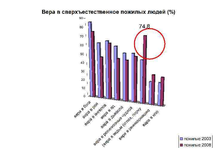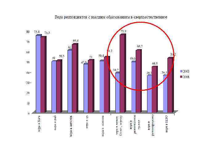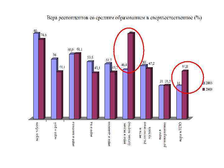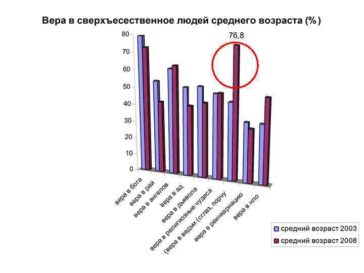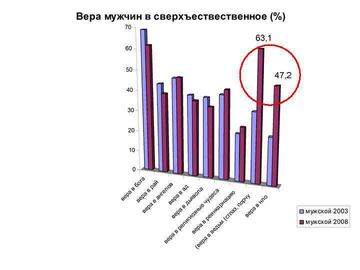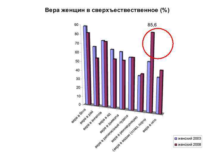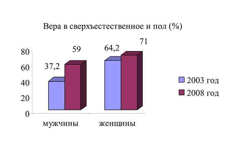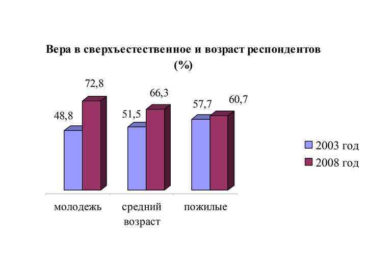 Динамика социальных закономерностей 2003 год 2008 год верят в сверхъестественное • пожилые люди (коррел. -0, 2, знач. 0, 005) • молодые люди (коррел. 0, 2, знач. 0, 02) • женщины (коррел. -0, 3, знач. 0, 0000) • респонденты различного пола (коррел. – 0, 1, знач. 0, 0708) • респонденты с разным уровнем образования (коррел. 0, 002, знач. 0, 679) • респонденты с высшим образованием (коррел. - 0, 3, знач. 0, 006)