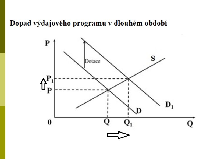 Díky dotaci stoupne poptávka z D na D 1. Při málo elastické nabídce v krátkém období se spíše zvedne cena nabízeného statku z P na P 1, než jeho nabízené množství (z Q na Q 1). Skutečným příjemcem v krátkém období je spíš strana nabídky než poptávky.