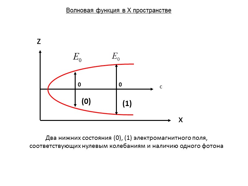 Два нижних состояния (0), (1) электромагнитного поля, соответствующих нулевым колебаниям и наличию одного фотона Волновая функция в Х пространстве x z (1) (0) 0 0 с