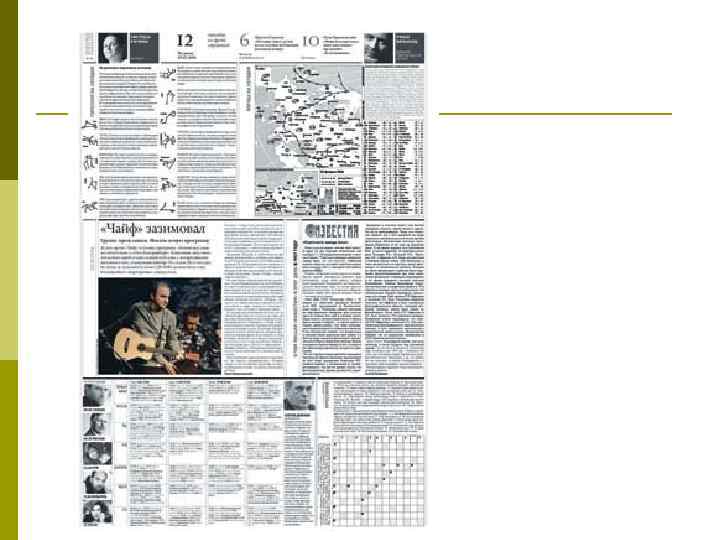 Последняя полоса здесь помещают мелкие информационные материалы, анекдоты, рекламные блоки, p верстают на большее число колонок. p Чаще применяют приемы ломаной верстки, стремясь разнообразить и оживить подачу материалов. p