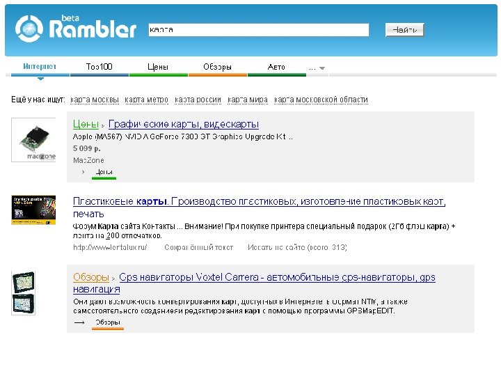 Rambler. Beta Цели Rambler. Beta 1. 0: • Мнение пользователей. • Сбор статистики (в т. ч. для улучшения работы релевантности вертикалей), исследования. • Монетизация.