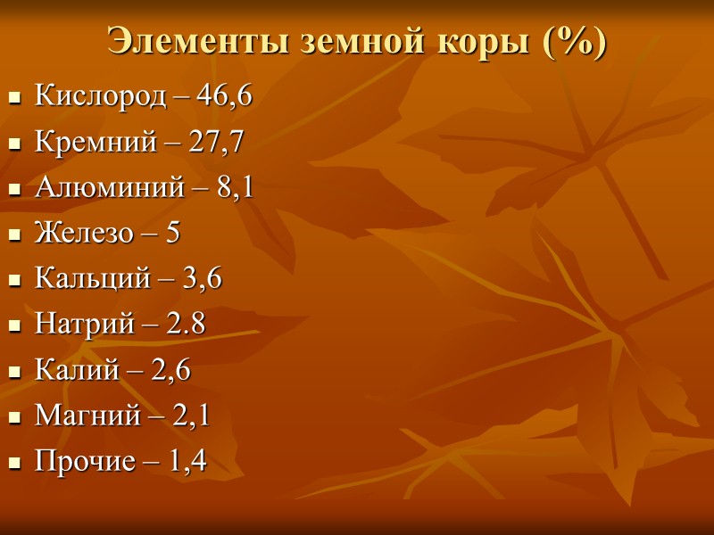 Элементы земной коры (%) Кислород – 46,6 Кремний – 27,7 Алюминий – 8,1 Железо – 5 Кальций – 3,6 Натрий – 2.8 Калий – 2,6 Магний – 2,1 Прочие – 1,4