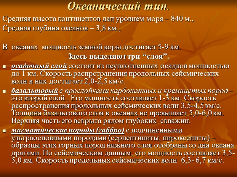 Океанический тип. Средняя высота континентов дан уровнем моря – 840 м., Средняя глубина океанов – 3,8 км., В океанах мощность земной коры достигает 5-9 км. Здесь выделяют три “слоя”. осадочный слой состоит из неуплотненных осадков мощностью до 1 км. Скорость распрстранения продольных сейсмических волн в них достигает 2,0-2,5 км/с. базальтовый с прослойками карбонатных и кремнистых пород – это второй слой.. Его мощность составляет 1-3 км. Скорость распространения продольных сейсмических волн 3,5-4,5 км/с. Толщина базальтового слоя в океанах не превышает 5,0-6,0 км. Верхняя часть его вскрыта рядом глубоких скважин. магматические породы (габбро) с подчиненными ультраосновными породами (серпентиниты, пироксениты) – образцы этих горных пород нижнего слоя отобраны со дна океана драгами. По сейсмическим данным, его мощность составляет 3,5-5,0 км. Скорость продольных сейсмических волн 6,3- 6,7 км/с.