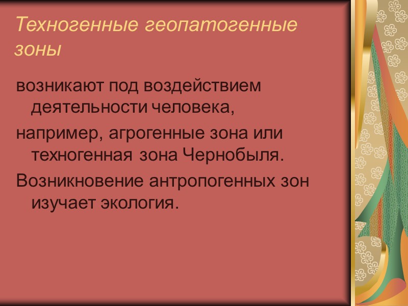Техногенные геопатогенные зоны возникают под воздействием деятельности человека, например, агрогенные зона или техногенная зона Чернобыля. Возникновение антропогенных зон изучает экология.