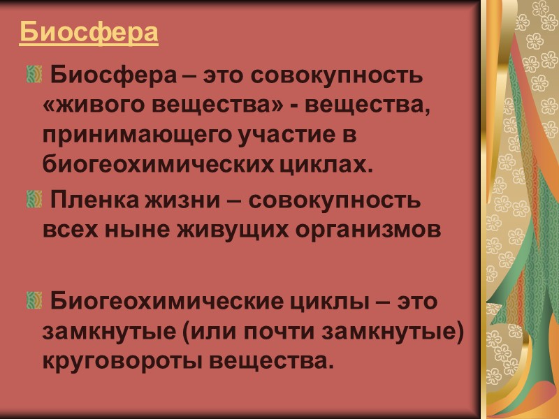 Биосфера Биосфера – это совокупность «живого вещества» - вещества, принимающего участие в биогеохимических циклах. Пленка жизни – совокупность всех ныне живущих организмов Биогеохимические циклы – это замкнутые (или почти замкнутые) круговороты вещества.