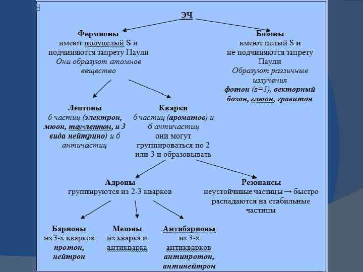 Классификация элементарных частиц В настоящее время открыто ~ 400 ЭЧ. Их исследования ведутся на ускорителях высоких энергий. Существует несколько классификаций ЭЧ. Мы рассмотрим одну из них – в её основе лежит свойство ЭЧ – спин (S). Спин – это собственный момент количества движения частицы. Он имеет всегда положительный знак (+), а его значение может быть целое (0, 1, 2…) или полуцелое (1/2, 3/2 …). Частицы с полуцелым спином могут находиться вместе лишь при условии, что их физические параметры (заряд, масса, «аромат» и т. п. ) не одинаковы – этот закон носит название Запрета Паули.