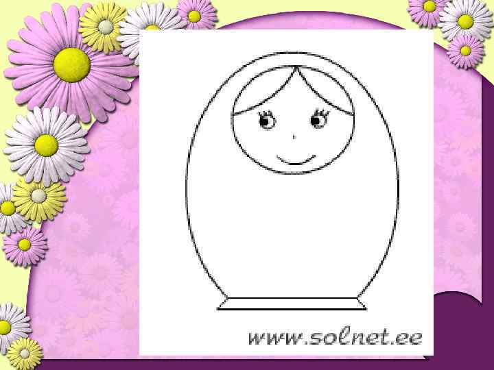 Практическая работа. Сегодня мы с вами, ребята выступим в роли волшебников по росписи матрёшки и создадим свою, не похожую на другие. Последовательность выполнения работы: 1. Провести вертикальную линию от макушки до самого низа. 2. Обвести контур матрёшки. 3. Нарисовать лицо вам поможет круг. 4. Осторожно нанести карандашом на лице 2 горизонтальные линии. Верхнюю часть круга занимают волосы, в средней части глаза, а в нижней – губы и щёки. Носик обозначается 2 точками на нижней горизонтальной линии. 5. Обрати внимание, как у матрёшки нарисованы руки. 6. Нарисовать платок. 7. Заполнить передний фон сарафана матрёшки букетом цветов. 8. Раскрасить матрёшку. Декоративные цветы, украшающие матрёшку, не должны появиться ранее того, как будет подготовлена однотонная раска основных частей одежды.