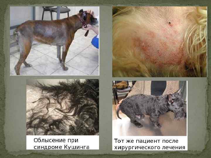 СИМПТОМЫ * наблюдается жажда и мочеиспускание * ухудшение качества шерсти и появление обширных залысин. Бесшерстные участки распределяются симметрично, локализуются в области туловища, хвоста и на шее. * довольно скоро после возникновения первых признаков заболевания у сук пропадают течки * животные становятся менее подвижны * меняется телосложение: происходит потеря жира из подкожной жировой клетчатки, атрофируются мышцы. Вследствие слабости мышц брюшной стенки живот увеличивается в объеме и отвисает. В результате имеется худая собака с объемным животом и обширными лысинами.
