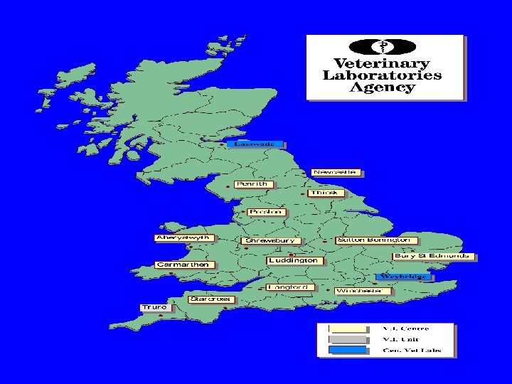 Surveillance of Veterinary Clinical Submissions at Regional Diagnostic Laboratories. • The VLA has 14 Regional Laboratories that are strategically located throughout England Wales, ensuring coverage of all regions of these countries. • Surveillance is achieved through incoming carcase material and specimens. • Susceptibility testing is provided as part of the laboratory diagnostic service. In general, disc diffusion testing is performed.