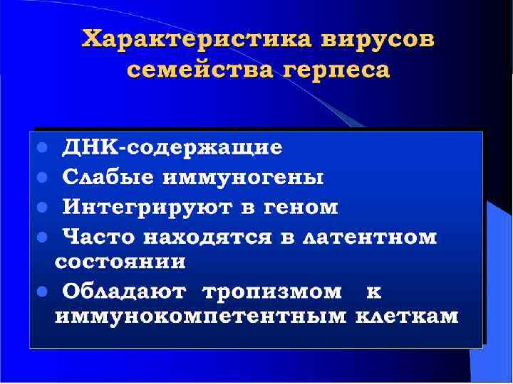 Уникальное биологическое свойство герпес-вирусов – тканевой тропизм: персистенция – способность непрерывно или циклически размножаться в инфицированных клетках латенция – пожизненное сохранение ГВ в морфологически и иммунохимически в видоизмененной форме в нервных клетках и регионарных ганглиях чувствительных нервов