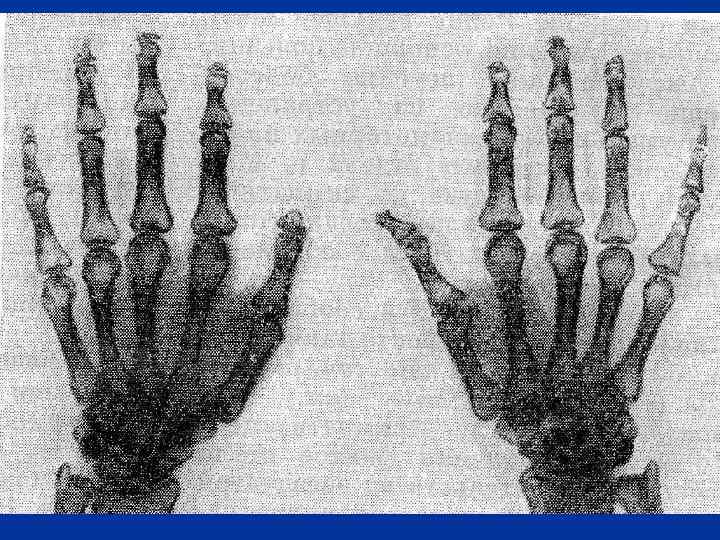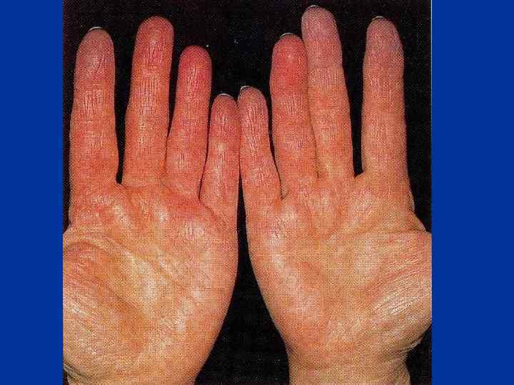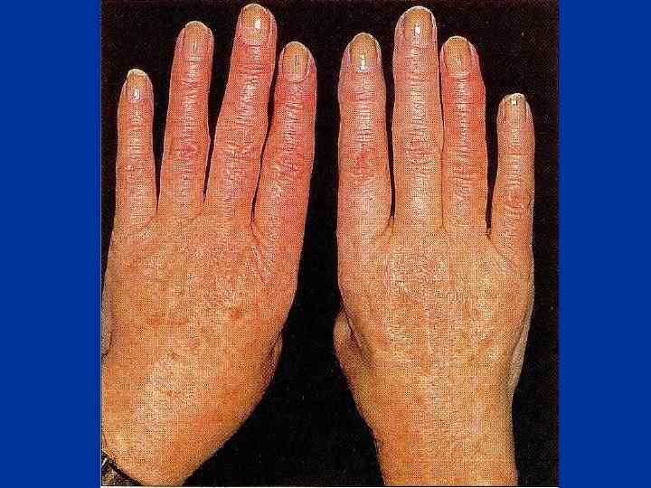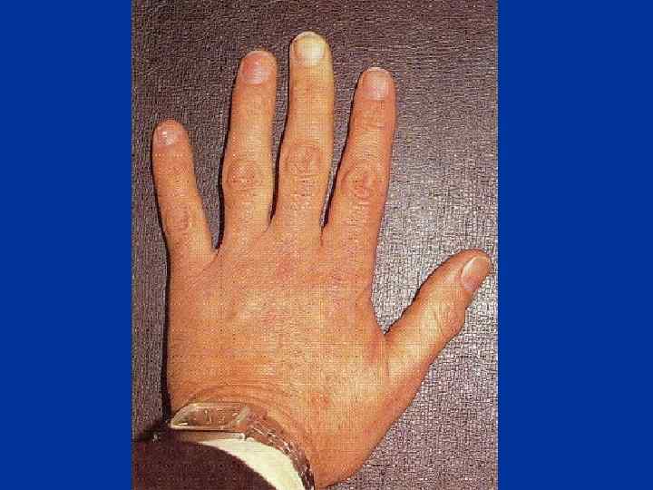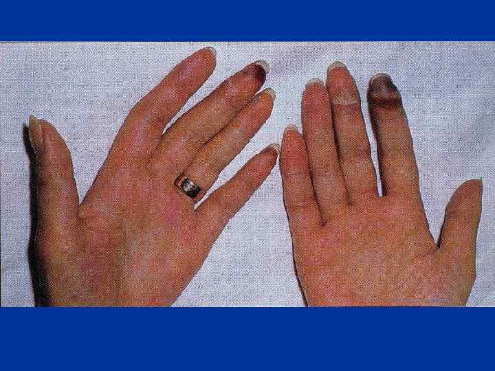 - Симптом «перчаток и носков» , полукуртки и куртки (дистальный и сегментарный типы) - Изменения кистей рук (отечность пальцев и их деформация, стертость кожного рисунка, гиперкератоз). Ладьевидная кисть, барабанные пальцы - Снижение силы, тонуса и выносливости мышц - Симптомы вегетативной дисфункции и астении
