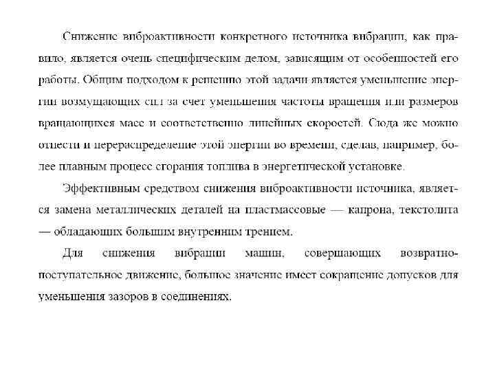 1. В качестве параметра вибрации при ее измерении и нормировании целесообразно использовать виброускорение, определяемое в октавных (треть-ктавных) полосах частот. 2. Общим подходом к снижению виброактивности машин является уменьшение энергии возмущающих сил за счет снижения частоты вращения и размеров вращающихся масс, а так же повышение точности обработки деталей и как следствие – уменьшение зазоров в соединениях. 3. Эффективным средством снижения вибрации механических систем является увеличение в них демпфирования путем замены металлических деталей на пластмассовые и использованием специальных вибродемпфирующих покрытий. 4. Основным методом защиты объектов от вибрации является виброизоляция. Она эффективна, если частота возбуждающего воздействия будет по крайнем мере в √ 2 больше собственной частоты системы виброизоляции. 5. Динамические гасители колебаний следует применять для гашения колебаний в узкой полосе частот, когда собственная частота объекта близка к частоте возбуждающего воздействия. Их эффективность в значительной степени зависит от величины демпфирования в системе. 6. Оборудование, являющееся интенсивным источником вибрации следует устанавливать на фундаменты. При этом массу фундамента подбирают так, чтобы амплитуда колебаний подошвы фундамента не превышала допустимой величины. 7. Для защиты машин от низкочастотной вибрации, где пассивные системы малоэффективны, следует использовать активные гасители колебаний. 8. Для существенного снижения вибрации, передаваемой через грунт от движущегося железнодорожного транспорта, следует применять целый комплекс защитных мероприятий, касающихся снижения вибрации, как в самом источнике, так и на пути ее распространения.