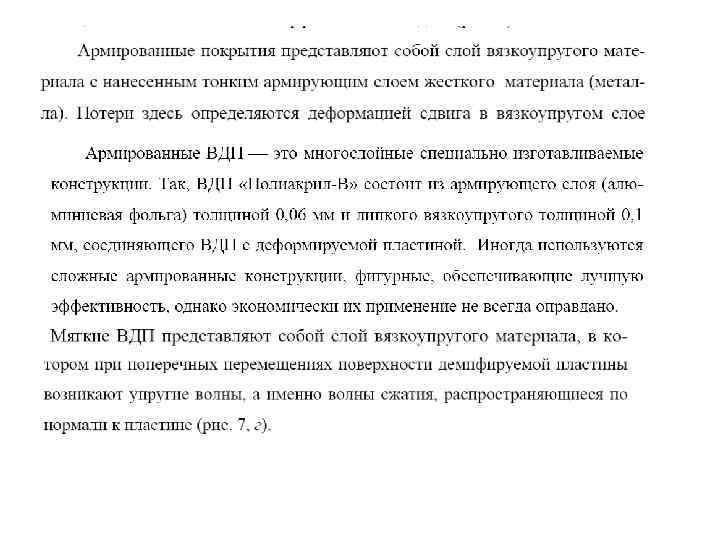 • Применение упругих элементов в конструкции железнодорожного полотна. При этом используются: • упругое крепление рельсов, с целью виброизоляции рельса от шпал и грунтового основания пути. Коэффициент постели K, равный жесткости крепления, деленной на величину пролета между соседними креплениями, должен составлять порядка 2· 107 Н/м. Виброизоляция рельсов считается хорошей, если она обеспечивает статический прогиб при нагрузке поездом в пределах 2− 5 мм; • упругое основание под шпалами, позволяющее в сочетании с упругим креплением рельсов поучить дополнительное снижение уровня вибрации до 10 д. Б; «плавающее» основание пути, представляющее собой бетонную конст-рукцию толщиной 0, 2− 0, 3 м, монолитную или состоящую из отдельных бло-ков длиной 1, 5, которая опирается упругие прокладки. Типичный диапазон резонансных частот конструкций с «плавающими плитами» 12 -16 Гц.