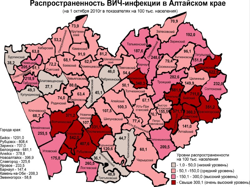 Всего зарегистрировано случаев ВИЧ-инфекции - 10158 чел., в т.ч. 2377 - в учреждениях исполнения наказания. ВИЧ-инфекция регистрируется в 11 городах и 57 районах Алтайского края. Пол Возраст М Ж 0-14 15-17 18-19 20-29 30 и > Абс. число 6968 3190 95 240 592 5370 3861 % 68,6 31,4 0,9 2,4 5,8 52,9 36,0 ВИЧ-ИНФЕКЦИЯ/СПИД В АЛТАЙСКОМ КРАЕ ПО ДАННЫМ НА 01.05.2010г.