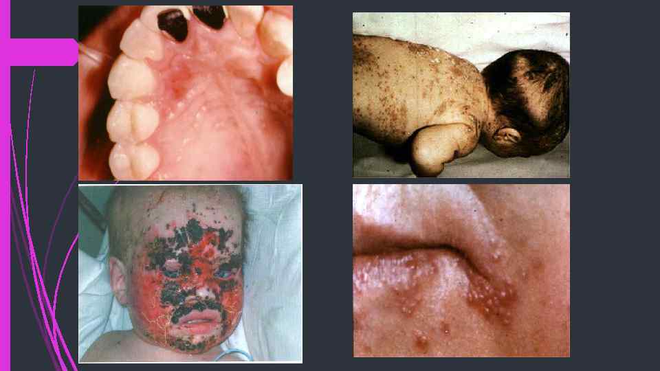 ВИЧ - ЭМБРИОПАТИЯ • Короткий нос со сглаженной перегородкой • Задержка роста • Гипертелоризи (ненормально большое расстояние между глазами) • Щирокий плосковыступающий лоб • Треугольный выпирающий желобок верхней губы • Голубые склеры • Косоглазие • Косолапие • Широкие глазные щели • Яркая –красная кайма губ • Незаращение верхней губы • Микроцефалия