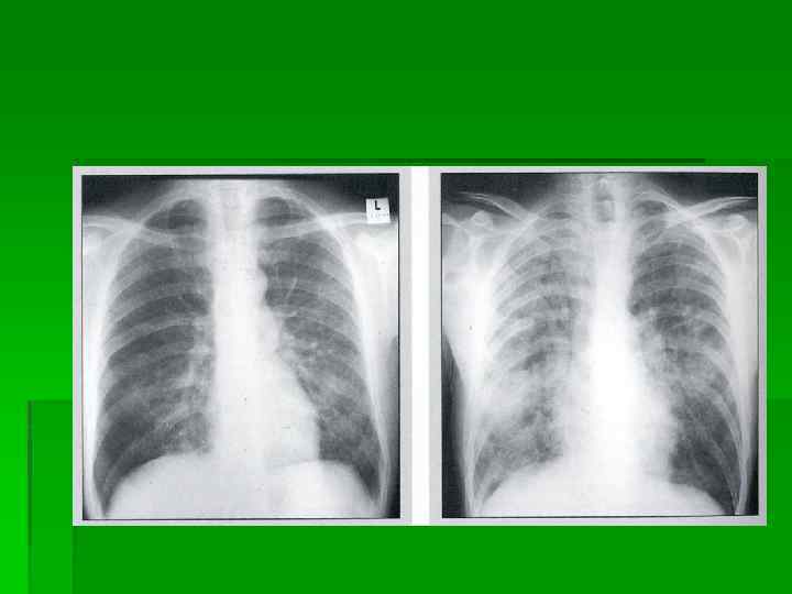 Клиника пневмоцистной пневмонии § Лихорадка и следующие симптомы: § признаки дыхательной недостаточности (с цианозом или без), одышка § сухой кашель § при физикальном исследовании грудной клетки нарушения минимальны или отсутствуют § Рентгенография грудной клетки: § облаковидное снижение прозрачности в нижних отделах обоих легких, симптом «матового стекла»