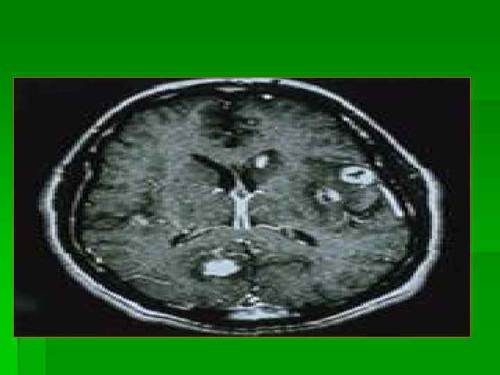 Токсоплазмоз § У больных ВИЧ-инфекцией -6 -40%больных ВИЧинфекцией – 3 -40% По нашим данным – 6% Латентный и хронический токсоплазмоз: тяжелое генерализованное течение менингоэнцефалит, абсцессы мозга, образованию множественных кист головного мозга §