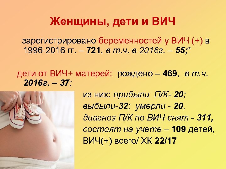 Женщины, дети и ВИЧ зарегистрировано беременностей у ВИЧ (+) в 1996 -2016 гг. – 721, в т. ч. в 2016 г. – 55; * дети от ВИЧ+ матерей: рождено – 469, в т. ч. 2016 г. – 37; из них: прибыли П/К- 20; выбыли-32; умерли - 20, диагноз П/К по ВИЧ снят - 311, состоят на учете – 109 детей, ВИЧ(+) всего/ ХК 22/17
