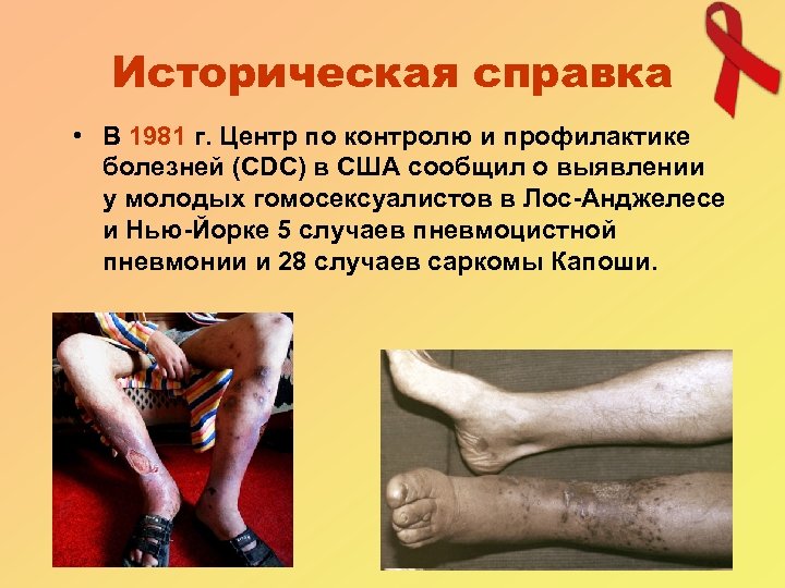 Историческая справка • В 1981 г. Центр по контролю и профилактике болезней (CDC) в США сообщил о выявлении у молодых гомосексуалистов в Лос-Анджелесе и Нью-Йорке 5 случаев пневмоцистной пневмонии и 28 случаев саркомы Капоши.