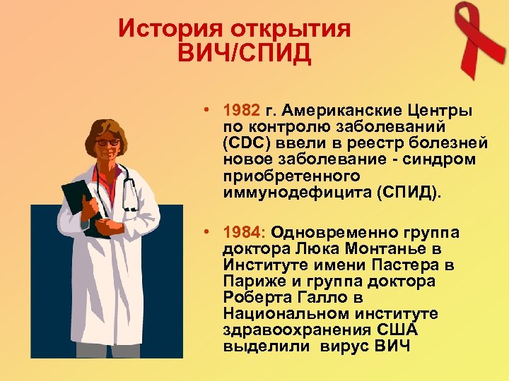История открытия ВИЧ/СПИД • 1982 г. Американские Центры по контролю заболеваний (CDC) ввели в реестр болезней новое заболевание - синдром приобретенного иммунодефицита (СПИД). • 1984: Одновременно группа доктора Люка Монтанье в Институте имени Пастера в Париже и группа доктора Роберта Галло в Национальном институте здравоохранения США выделили вирус ВИЧ