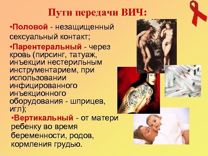 Пути передачи ВИЧ: • Половой - незащищенный сексуальный контакт; • Парентеральный - через кровь (пирсинг, татуаж, инъекции нестерильным инструментарием, при использовании инфицированного инъекционного оборудования - шприцев, игл); • Вертикальный - от матери ребенку во время беременности, родов, кормления грудью.