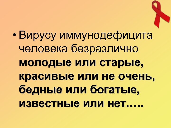 • Вирусу иммунодефицита человека безразлично молодые или старые, красивые или не очень, бедные или богатые, известные или нет. ….