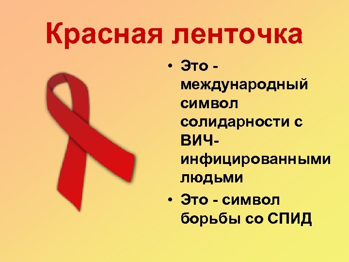 Красная ленточка • Это международный символ солидарности с ВИЧинфицированными людьми • Это - символ борьбы со СПИД