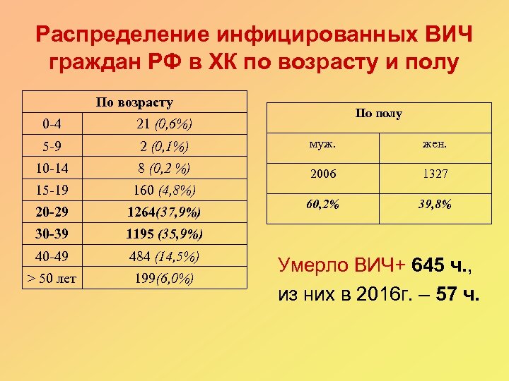 Распределение инфицированных ВИЧ граждан РФ в ХК по возрасту и полу По возрасту По полу 0 -4 21 (0, 6%) 5 -9 2 (0, 1%) муж. жен. 10 -14 8 (0, 2 %) 2006 1327 15 -19 160 (4, 8%) 20 -29 1264(37, 9%) 60, 2% 39, 8% 30 -39 1195 (35, 9%) 40 -49 484 (14, 5%) > 50 лет 199(6, 0%) Умерло ВИЧ+ 645 ч. , из них в 2016 г. – 57 ч.