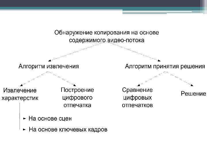 Цифровой отпечаток • Цифровой отпечаток (digital video fingerprint) набор бит, представляющий какие-то уникальные характеристики видеопоследовательности, отражающие уникальное содержимое видео-файла; применяется в задачах обнаружения копирования на основе содержимого видеопотока. • зависит от содержания видео; • незначительное количество исследований до настоящего времени; • отсутствие реализаций в открытом доступе.