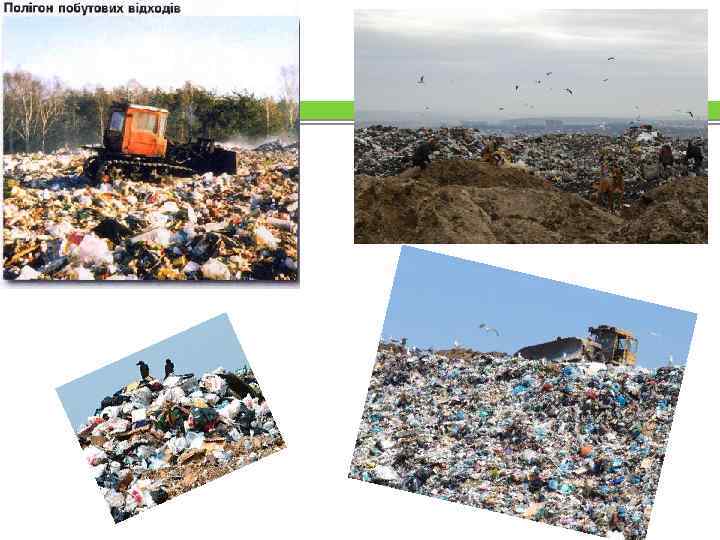 Полігони(сміттєзвали ща) Найбільші площі під полігони зайняті в Дніпропетровській — 140 гектарів, Донецькій — 330, Одеській — 195, Запорізькій — 153, Луганські області — 129 гектарів.