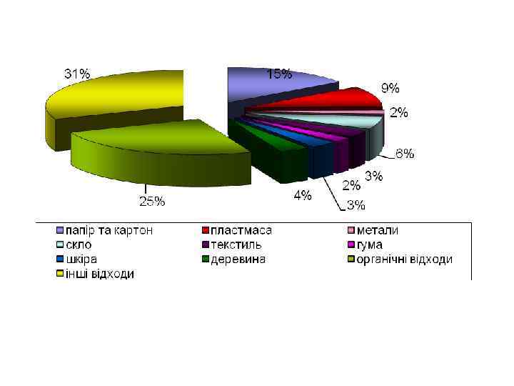 Зміст Що таке відходи? Карта забруднення області Показники поводження з промисловими токсичними відходами Класифікація відходів Класи небезпеки відходів Промислові відходи Відходи населених пунктів Побутові відходи та їх види Переробка Символи переробки Збирання Спалювання Ферментація Полігони(сміттєзвалища)