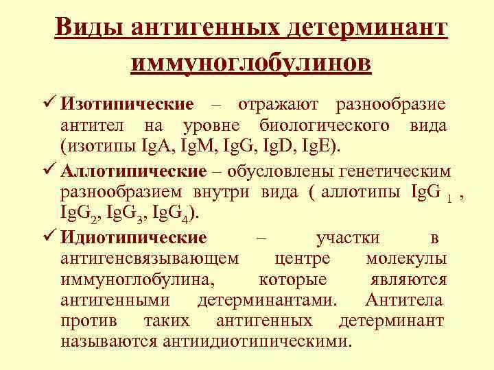 Виды антигенных детерминант иммуноглобулинов ü Изотипические – отражают разнообразие антител на уровне биологического вида (изотипы Ig. A, Ig. M, Ig. G, Ig. D, Ig. E). ü Аллотипические – обусловлены генетическим разнообразием внутри вида ( аллотипы Ig. G 1 , Ig. G 2, Ig. G 3, Ig. G 4). ü Идиотипические – участки в антигенсвязывающем центре молекулы иммуноглобулина, которые являются антигенными детерминантами. Антитела против таких антигенных детерминант называются антиидиотипическими.