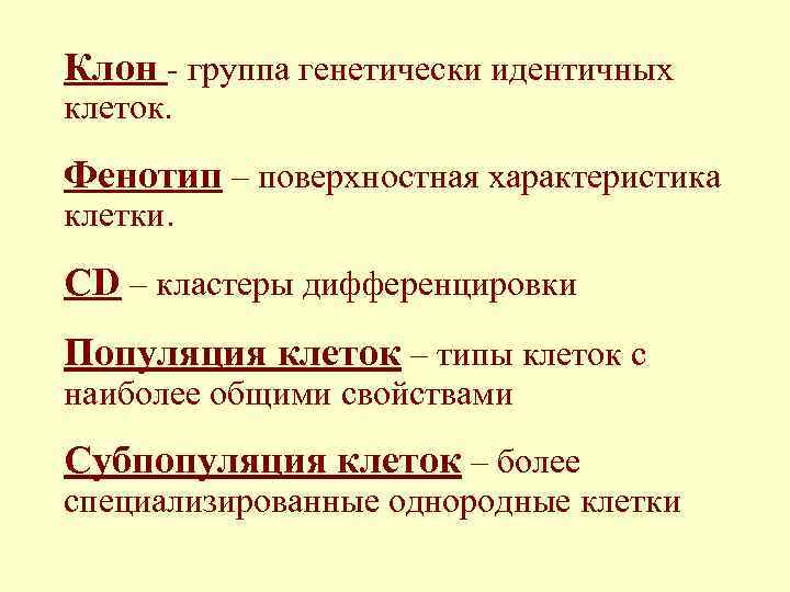 Клон - группа генетически идентичных клеток. Фенотип – поверхностная характеристика клетки. CD – кластеры дифференцировки Популяция клеток – типы клеток с наиболее общими свойствами Субпопуляция клеток – более специализированные однородные клетки