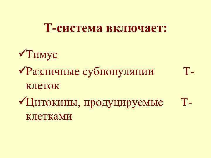 Т-система включает: üТимус üРазличные субпопуляции Т- клеток üЦитокины, продуцируемые Т- клетками