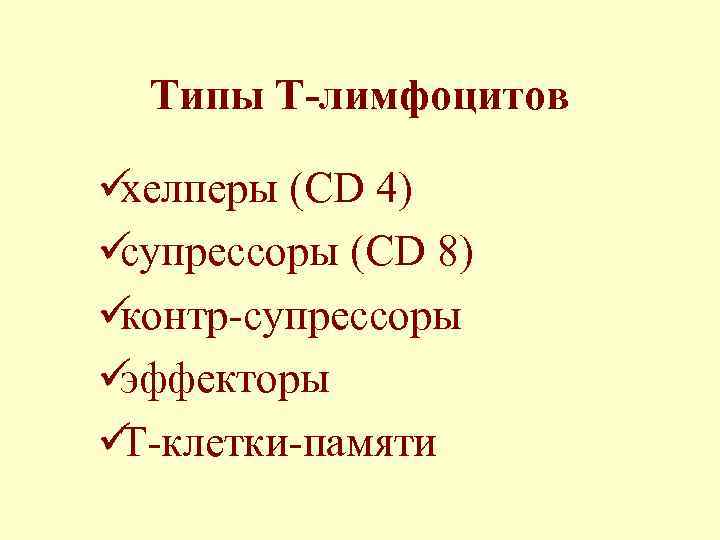 Типы Т-лимфоцитов üхелперы (CD 4) üсупрессоры (CD 8) üконтр-супрессоры üэффекторы üТ-клетки-памяти
