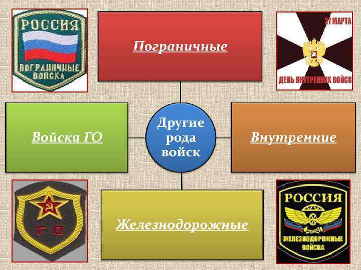 Задание № 1 Задание № 2 Задание № 3 Рода войск ВС РФ Другие войска ВС РФ Назначение Руководство Назначение Виды Исторические Вооруженных сведения Рода войск Войска Сил РФ Сухопутные Пограничные войска Ракетные войска стратегического назначения (РВСН) Железнодорожные войска Военно. Воздушно-десантные воздушные войска (ВДВ) силы Внутренние войска Космические войска Военно. Войска ГО морской флот