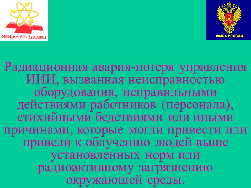 Радиационная авария-потеря управления ИИИ, вызванная неисправностью оборудования, неправильными действиями работников (персонала), стихийными бедствиями или иными причинами, которые могли привести или привели к облучению людей выше установленных норм или радиоактивному загрязнению окружающей среды.