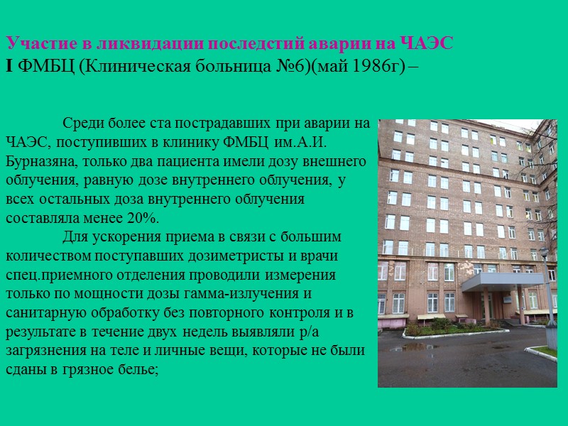 Участие в ликвидации последстий аварии на ЧАЭС I ФМБЦ (Клиническая больница №6)(май 1986г) – Среди более ста пострадавших при аварии на ЧАЭС, поступивших в клинику ФМБЦ им.А.И. Бурназяна, только два пациента имели дозу внешнего облучения, равную дозе внутреннего облучения, у всех остальных доза внутреннего облучения составляла менее 20%. Для ускорения приема в связи с большим количеством поступавших дозиметристы и врачи спец.приемного отделения проводили измерения только по мощности дозы гамма-излучения и санитарную обработку без повторного контроля и в результате в течение двух недель выявляли р/а загрязнения на теле и личные вещи, которые не были сданы в грязное белье;