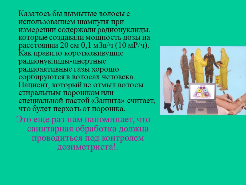 Казалось бы вымытые волосы с использованием шампуня при измерении содержали радионуклиды, которые создавали мощность дозы на расстоянии 20 см 0,1 мЗв/ч (10 мР/ч). Как правило короткоживущие радионуклиды-инертные радиоактивные газы хорошо сорбируются в волосах человека. Пациент, который не отмыл волосы стиральным порошком или специальной пастой «Защита» считает, что будет перхоть от порошка. Это еще раз нам напоминает, что санитарная обработка должна проводиться под контролем дозиметриста!.