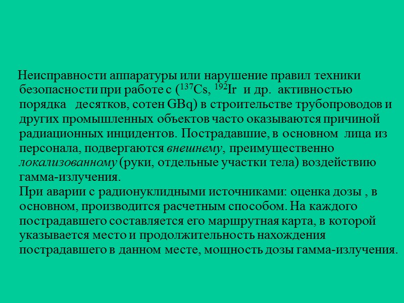 Неисправности аппаратуры или нарушение правил техники безопасности при работе с (137Cs, 192Ir и др. активностью порядка десятков, сотен GBq) в строительстве трубопроводов и других промышленных объектов часто оказываются причиной радиационных инцидентов. Пострадавшие, в основном лица из персонала, подвергаются внешнему, преимущественно локализованному (руки, отдельные участки тела) воздействию гамма-излучения. При аварии с радионуклидными источниками: оценка дозы , в основном, производится расчетным способом. На каждого пострадавшего составляется его маршрутная карта, в которой указывается место и продолжительность нахождения пострадавшего в данном месте, мощность дозы гамма-излучения.