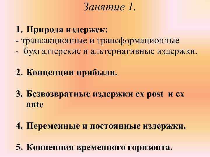 Виды издержек Трансформа ционные Производственные критерий выделения – способ возникновения Трансакционные Издержки поиска информации Издержки оппотурнистического поведения Издержки обращения Издержки измерения качества Издержки специфика ции и защиты прав собственности Издержки ведения переговоров и заключения контрактов