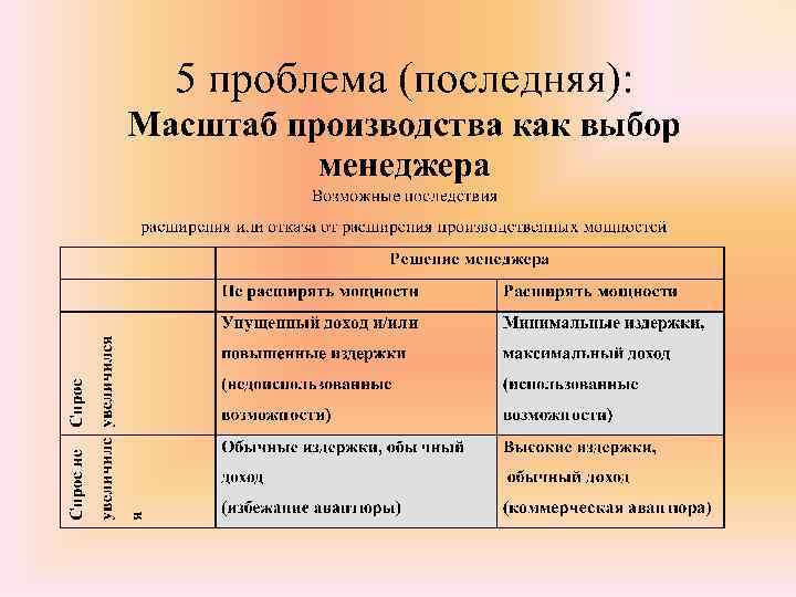 Масштаб производства соотношение изменения объема производства при изменении количеств всех используемых ресурсов Экономия на масштабах производства Специализация ресурсов Дезэкономия на масштабах производства Транспортные расходы Технологические причины Совместное производство продукции Распределение накладных расходов Отсутствие стимулов к эффективному труду